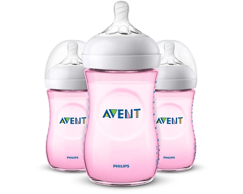 Philips Avent Natural 9 Ounce Pink Bottle is the most natural way to bottle feed. The wide breast-shaped nipple on the Natural bottle promotes natural latch-on so you can easily combine breastfeeding and bottle feeding. The ultra soft nipple mimics the feel of the breast. Our flexible spiral design combined with the comfort petals allow for a natural movement while baby feeds. The bottles have unique Airflex vent technology integrated into the nipple and are designed to reduce colic and discomfort by venting air away from your baby's tummy. The ergonomic shape makes it comfortable for parents to hold and easy for small fingers to grasp. Assembly is simple with only a few parts and the wide bottle neck makes filling and cleaning easy. The Natural bottle is made from polypropylene, a BPA free material, and works with all nipples and caps from the Natural line. SCF013/38