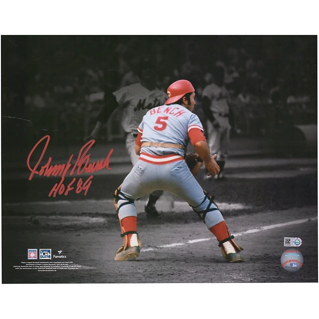 Photographie autographiée de 11"x 14" de Johnny Bench des Reds de Cincinnati avec l'inscription "HOF 89"