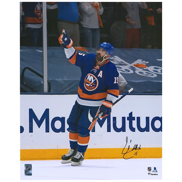 Photographie autographiée de 16" x 20" de Cal Clutterbuck, maillot bleu des New York Islanders