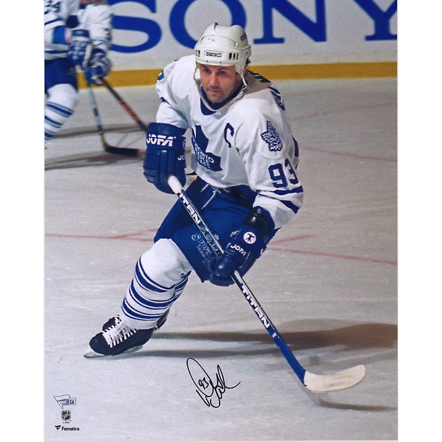 Photographie autographiée de 16" x 20" de Doug Gilmour en maillot blanc des Maple Leafs de Toronto en train de patiner
