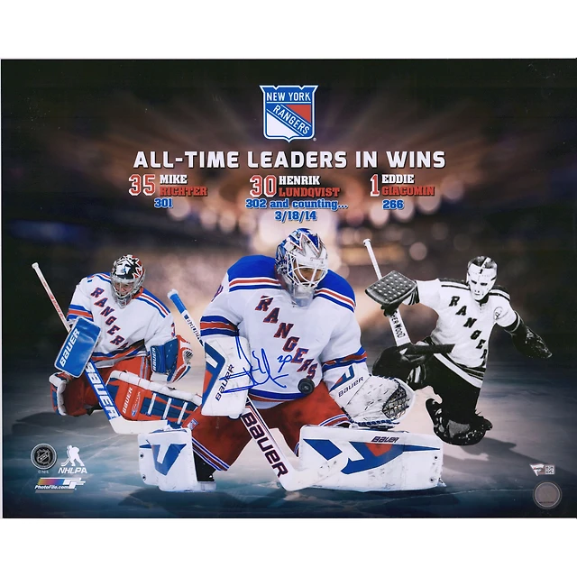 Photographie autographiée de 16" x 20" de Henrik Lundqvist des Rangers de New York, victoires de franchise, leaders