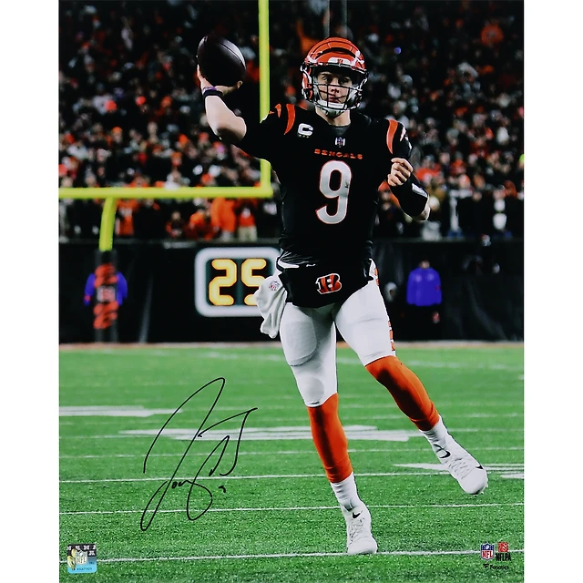 Photographie autographiée de 16" x 20" de Joe Burrow Cincinnati Bengals en train de lancer la nuit en maillot noir