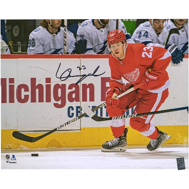 Photographie autographiée de 16'' x 20'' de Lucas Raymond pour ses débuts en patinage dans la LNH avec les Red Wings de Detroit