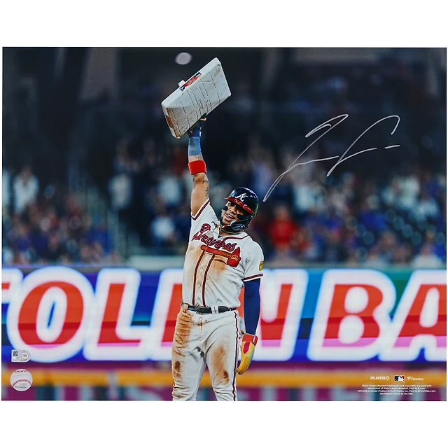 Photographie autographiée de 16" x 20" de Ronald Acuña Jr. Atlanta Braves tenant une base
