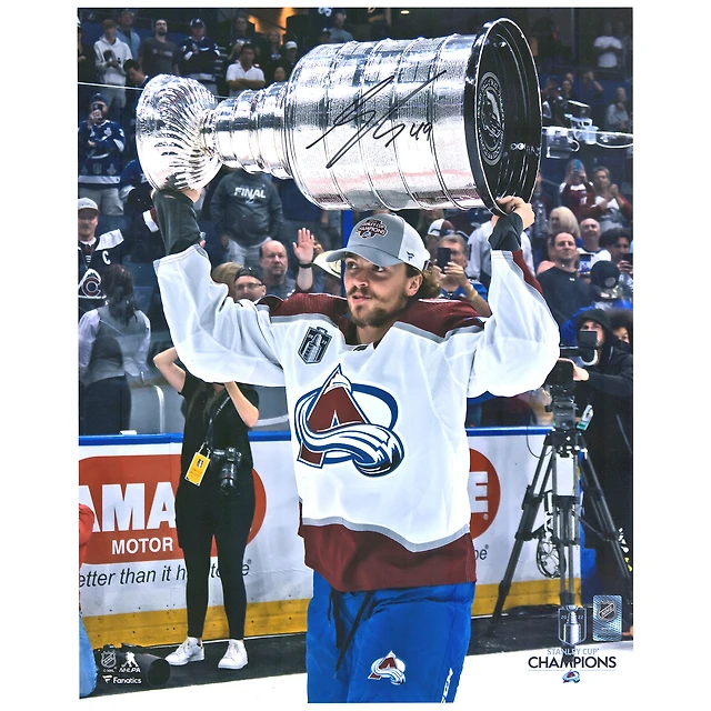 Photographie autographiée de 16" x 20" de Samuel Girard, champion de la Coupe Stanley 2022, soulevant la Coupe