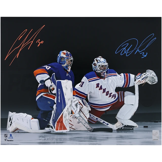 Photographie autographiée de 16" x 20" d'Igor Shesterkin des Rangers de New York et d'Ilya Sorokin des Islanders de New York sur un genou