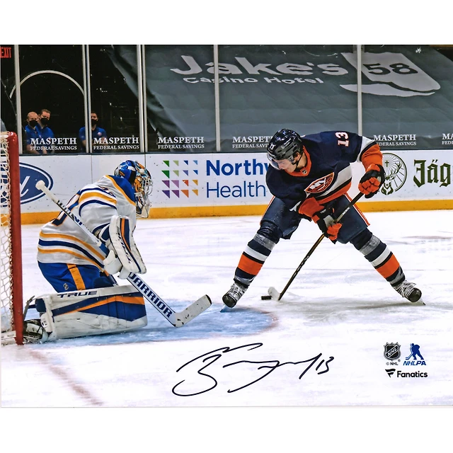 Photographie autographiée de 20,3 x 25,4 cm de Mathew Barzal des Islanders de New York lors du but entre les jambes contre les Sabres de Buffalo