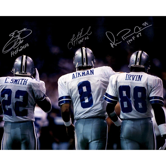 Photographie autographiée de 40,6 x 50,8 cm par Emmitt Smith, Troy Aikman et Michael Irvin des Cowboys de Dallas, avec plusieurs inscriptions HOF.