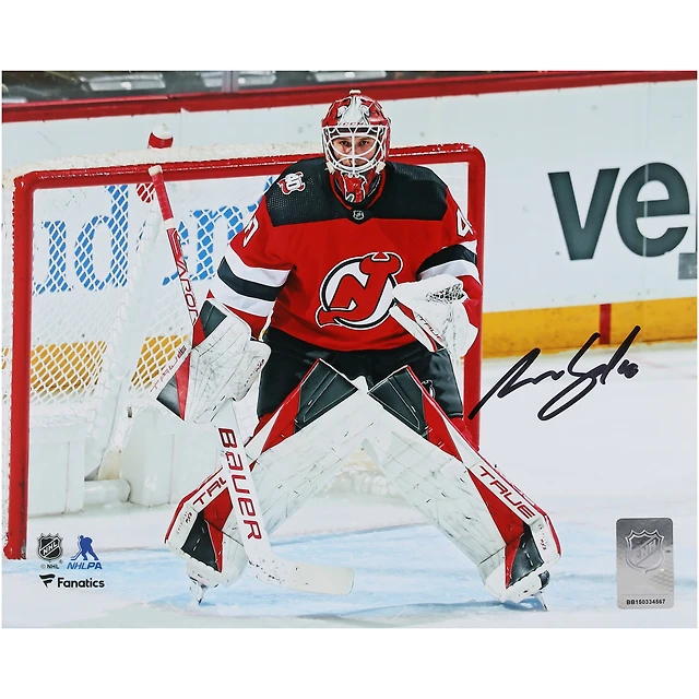 Photographie autographiée de 8" x 10" d'Akira Schmid, maillot rouge des Devils du New Jersey, dans le filet