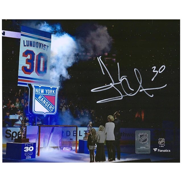Photographie autographiée de 8'' x 10'' de Henrik Lundqvist, membre des Rangers de New York, lors de la levée d'une bannière