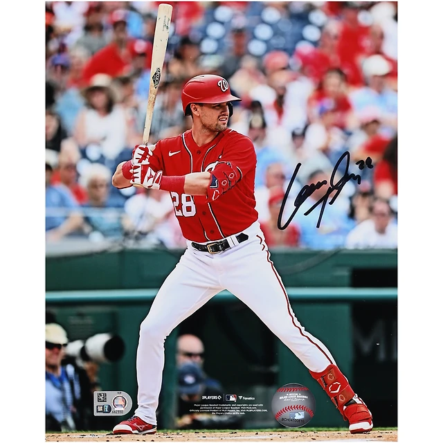 Photographie autographiée de 8" x 10" de Lane Thomas, joueur des Nationals de Washington, frappant avec un ballon rouge