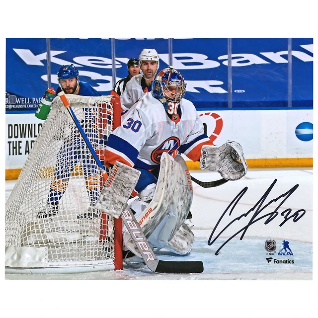 Photographie autographiée de 8" x 10" d'Ilya Sorokin des Islanders de New York, maillot blanc dans le filet