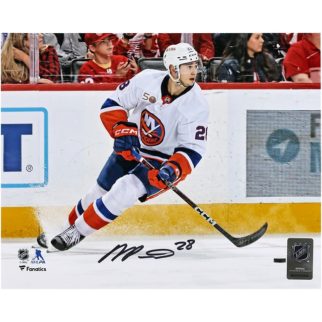 Photographie autographiée de 8" x 10" du maillot blanc avec rondelle des Islanders de New York Alexander Romanov