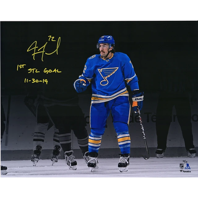 Photographie autographiée de célébration de but de Justin Faulk des Blues de St. Louis, 16" x 20", avec l'inscription "1st STL Goal 11" - Édition limitée à 19 exemplaires