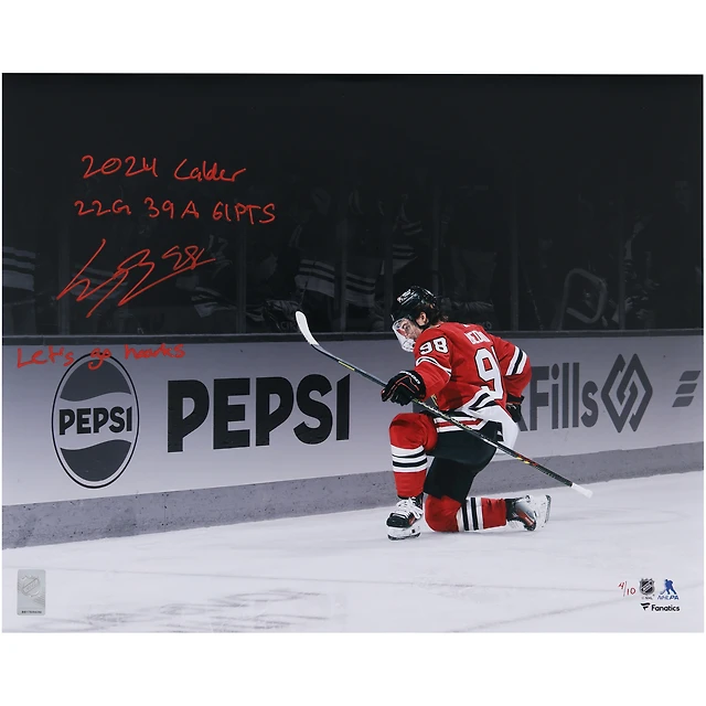 Photographie autographiée de Connor Bedard, maillot rouge des Blackhawks de Chicago, 16" x 20", avec inscriptions multiples - Édition limitée à 10 exemplaires