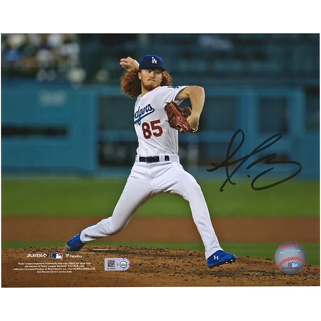 Photographie autographiée de Dustin May des Dodgers de Los Angeles montrant un lanceur avec la main levée