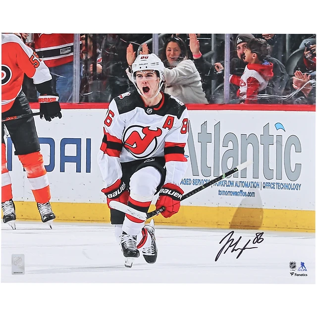Photographie autographiée de Jack Hughes, maillot blanc des Devils du New Jersey, 16" x 20"
