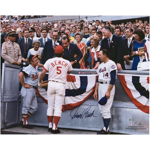 Photographie autographiée de Johnny Bench des Reds de Cincinnati 16" x 20" avec Richard Nixon Earl Weaver et Gil Hodges
