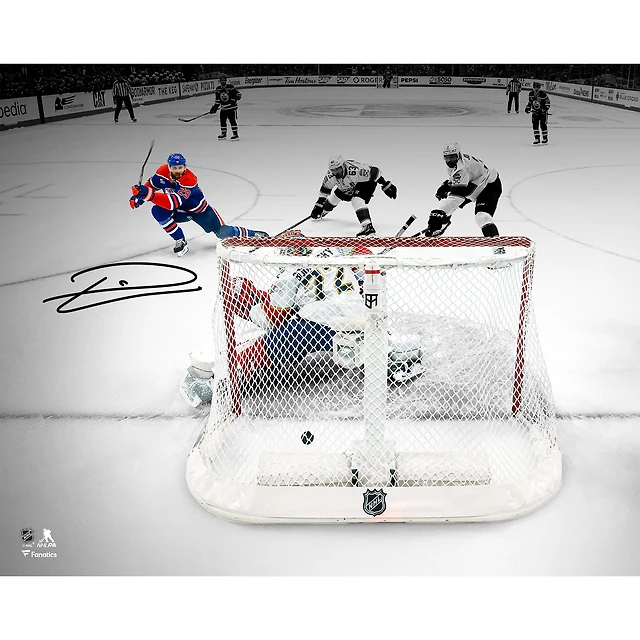 Photographie autographiée de Leon Draisaitl, 16" x 20" des Oilers d'Edmonton, lors du premier match de la finale de la Coupe Stanley 2025, mettant en vedette le but en prolongation