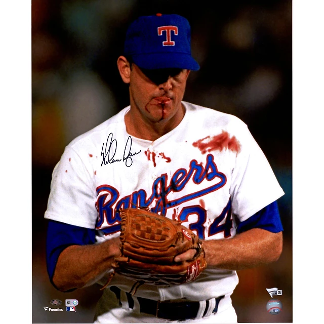 Photographie autographiée de Nolan Ryan avec une lèvre ensanglantée, 16" x 20" par les Texas Rangers