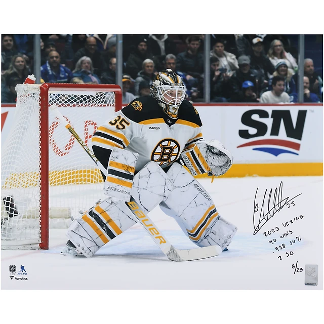 Photographie autographiée par Linus Ullmark des Bruins de Boston du vainqueur du trophée Vézina 2023, maillot blanc de 16" x 20" dans un filet avec plusieurs inscriptions - Édition limitée à 23 exemplaires
