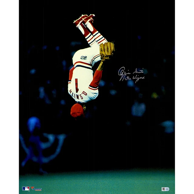Photographie autographiée par Ozzie Smith des Cardinals de St. Louis, 16" x 20" The Flip avec l'inscription "The Wizard"