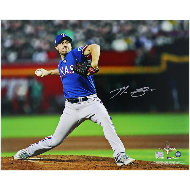 Photographie de 16" x 20" dédicacée par Max Scherzer des Texas Rangers, champions de la Série mondiale 2023