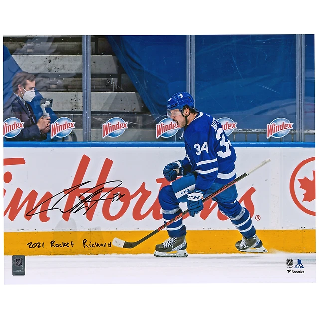 Photographie de célébration de but autographiée par Auston Matthews des Maple Leafs de Toronto de 16 po x 20 po avec l'inscription « 2021 Rocket Richard »