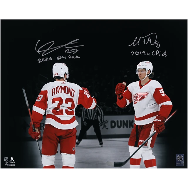 Photographie de célébration de but signée par Lucas Raymond et Moritz Seider des Red Wings de Detroit, 16" x 20", avec plusieurs inscriptions