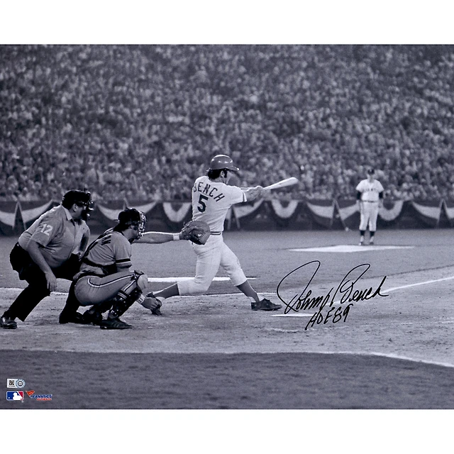 Photographie de frappe en noir et blanc autographiée de Johnny Bench des Reds de Cincinnati, 16" x 20", avec l'inscription "HOF 89"