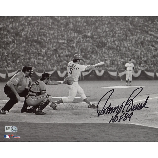 Photographie de frappe en noir et blanc autographiée de Johnny Bench des Reds de Cincinnati 8'' x 10'' avec l'inscription « HOF 89 »