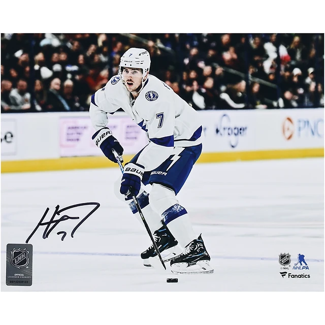 Photographie de patinage autographiée de 20,3 x 25,4 cm de Haydn Fleury, maillot blanc du Lightning de Tampa Bay