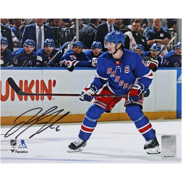 Photographie de patinage autographiée de 20,3 x 25,4 cm de Jacob Trouba, maillot bleu des Rangers de New York