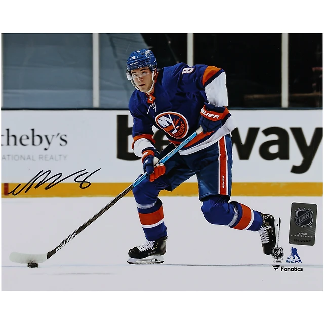 Photographie de patinage autographiée de 20,3 x 25,4 cm de Noah Dobson avec maillot bleu des Islanders de New York