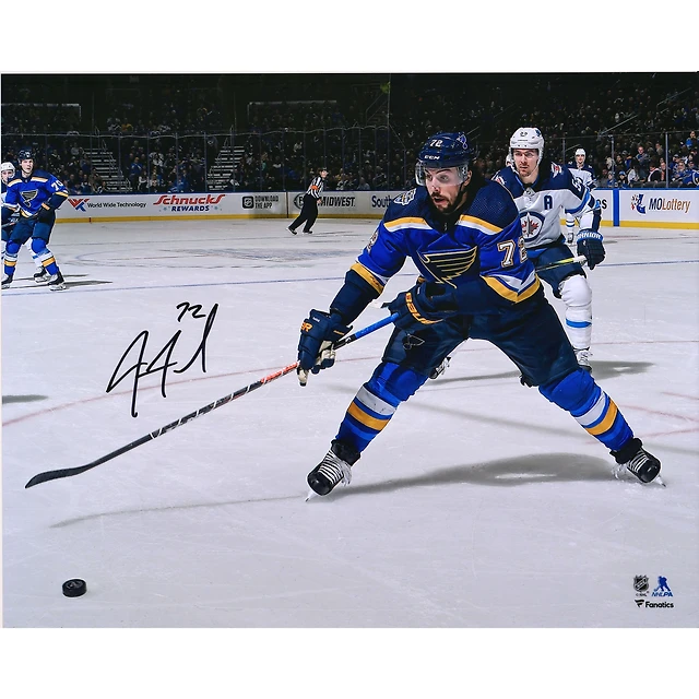 Photographie de patinage autographiée de Justin Faulk des Blues de St. Louis, maillot bleu, 16" x 20"