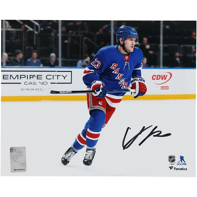 Photographie de patinage autographiée par Adam Fox des Rangers de New York, maillot bleu, 8" x 10"