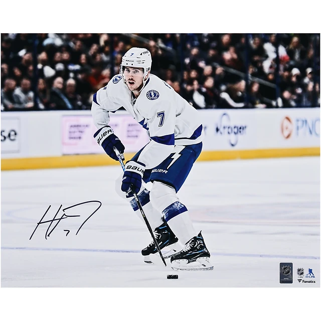 Photographie de patinage autographiée par Haydn Fleury du Lightning de Tampa Bay, maillot blanc de 16" x 20"