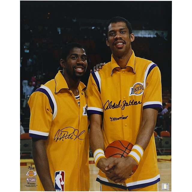 Photographie d'échauffement dédicacée de Magic Johnson et Kareem Abdul-Jabbar des Los Angeles Lakers (16 x 20 pouces) avec inscription « Showtime » - Édition limitée à 10 exemplaires
