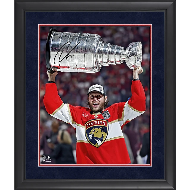 Photographie encadrée de 40,6 x 50,8 cm, dédicacée par Carter Verhaeghe, champion de la Coupe Stanley 2025, des Panthers de la Floride, soulevant la Coupe