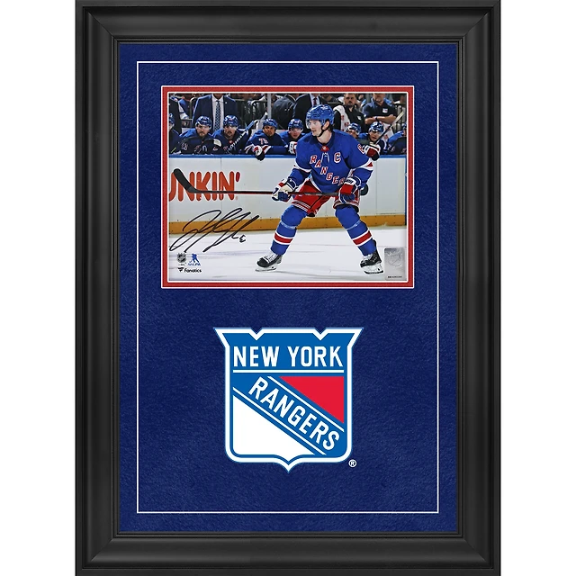 Photographie encadrée de luxe autographiée de Jacob Trouba, maillot bleu des Rangers de New York, 20 x 25 cm, en train de patiner