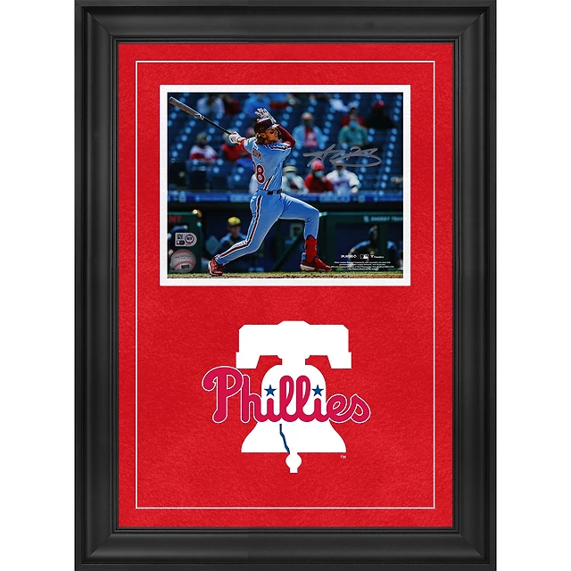 Photographie encadrée de luxe autographiée par Alec Bohm des Philadelphia Phillies, maillot bleu clair avec batte pivotante, 8" x 10"