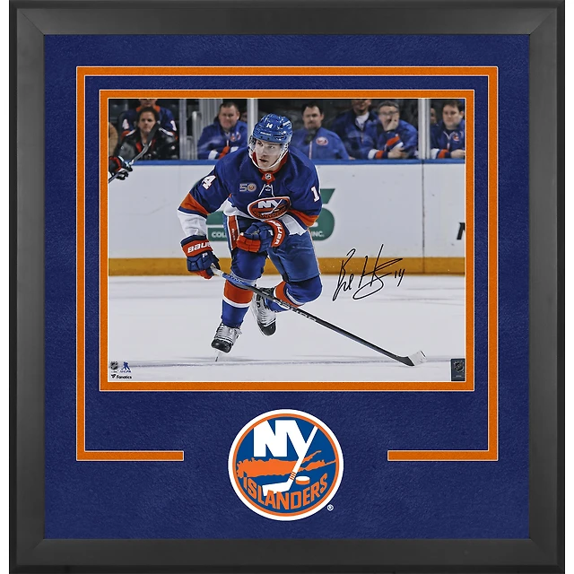 Photographie encadrée de luxe autographiée par Bo Horvat des Islanders de New York, maillot bleu, 16" x 20"