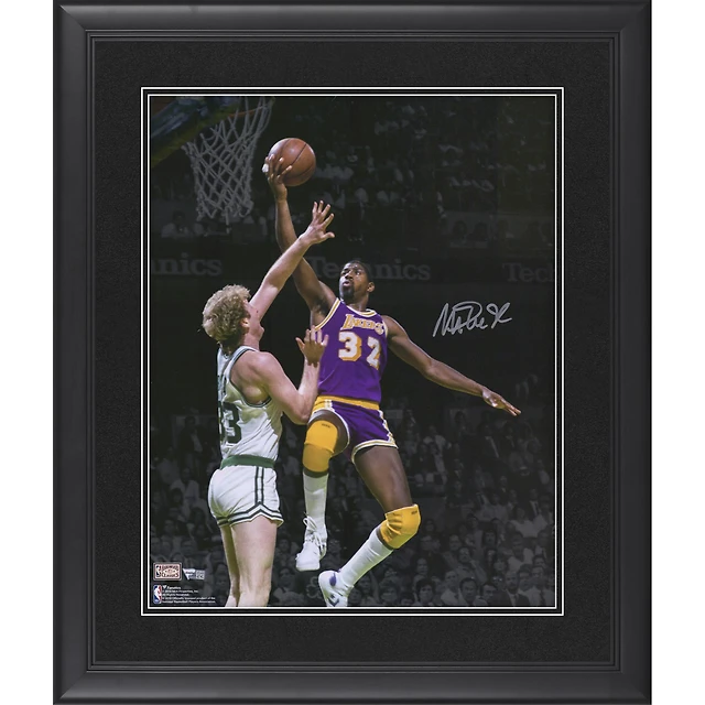 Photographie encadrée dédicacée de Magic Johnson des Los Angeles Lakers 16" x 20" Lay Up contre Larry Bird
