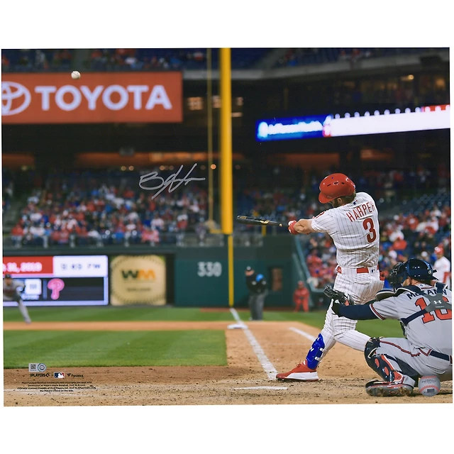 Photographie horizontale autographiée de 11"x 14" de Bryce Harper des Phillies de Philadelphie se balançant dans un maillot blanc