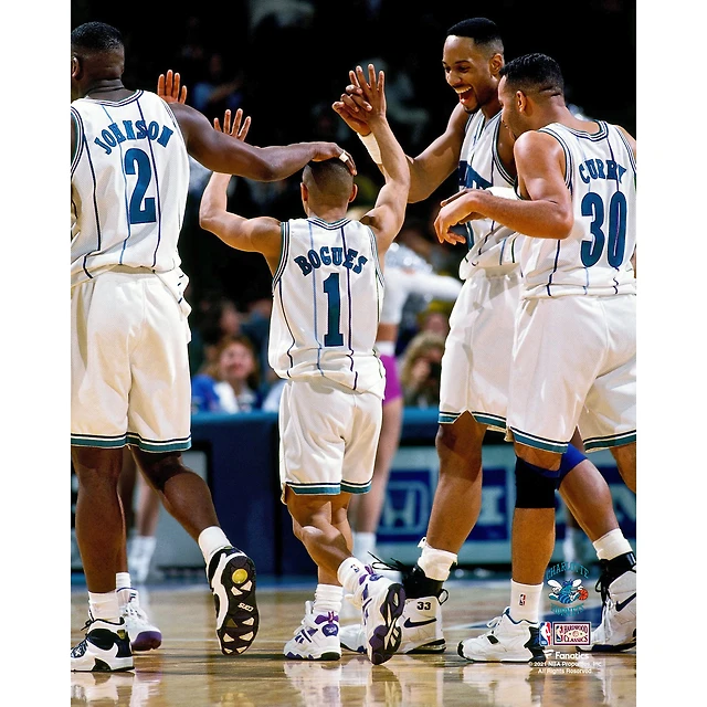 Photographie non signée de célébration des coéquipiers Muggsy Bogues Charlotte Hornets Hardwood Classics