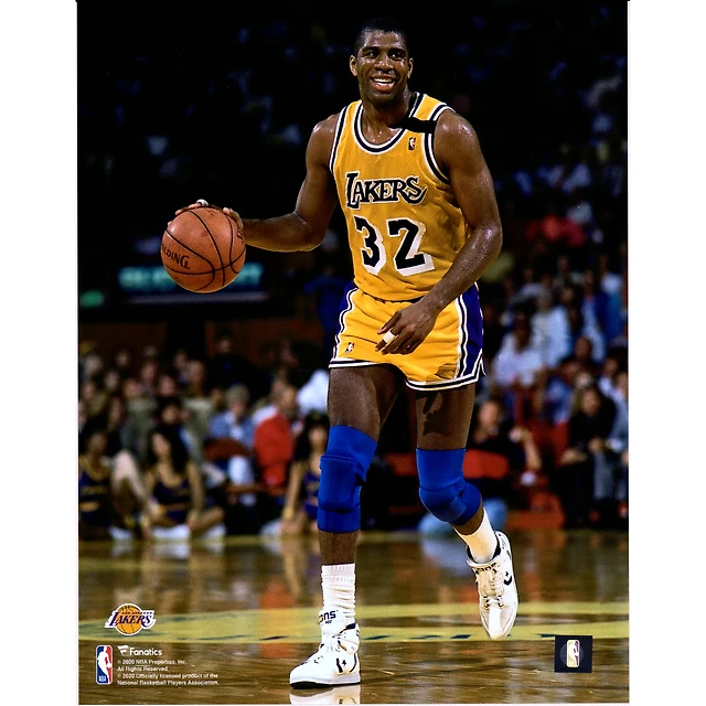 Photographie non signée de Magic Johnson en train dribbler avec les Los Angeles Lakers