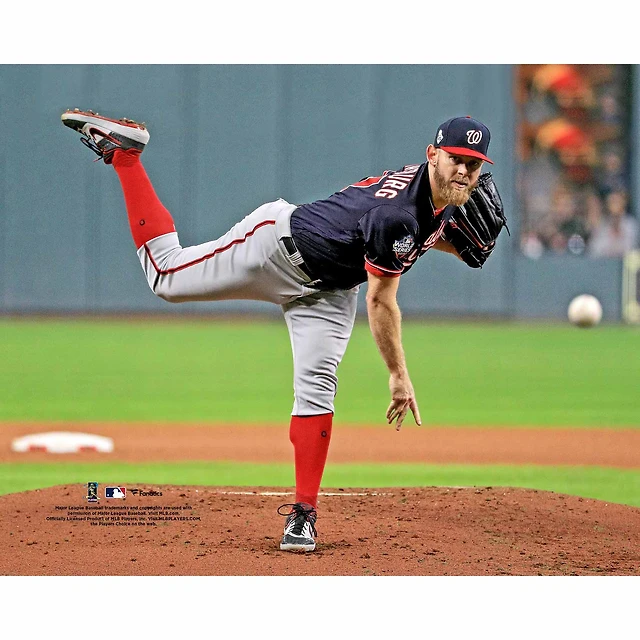 Photographie non signée de Stephen Strasburg, lanceur des Nationals Washington, lors la Série mondiale 2019