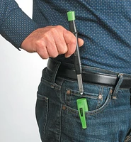 This carpenter’s pencil has a 2mm × 5mm lead that advances to the extent you need at the push of a button. The holster clips firmly to a belt or apron pocket and stays put when you withdraw the pencil.