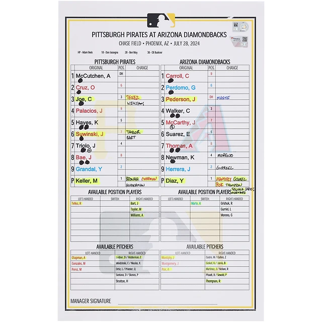 Pittsburgh Pirates Game-Used Lineup Card vs. Arizona Diamondbacks on July 28, 2024