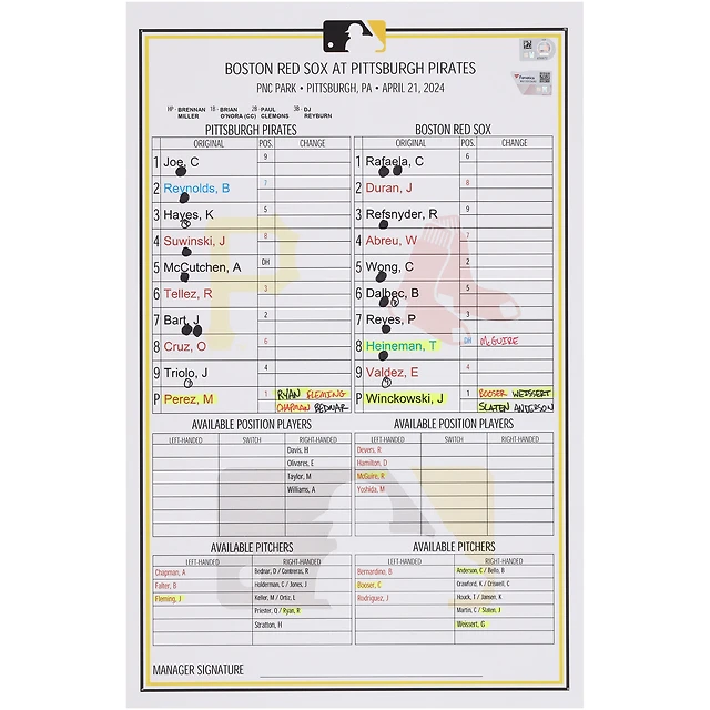 Pittsburgh Pirates Game-Used Lineup Card vs. Boston Red Sox on April 21, 2024
